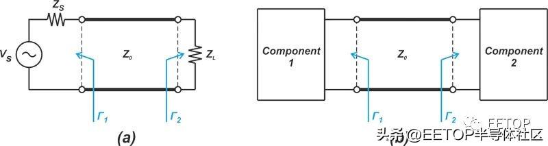 在图 6 中,我们隐含地假设信号源(未显示)的阻抗与线路特性阻抗匹配。如果不是这种情况,Pr 将重新反射源端的不连续性并影响入射波Pi。例如,当我们通过传输线将源连接到负载时(图 7(a))以及两个级联设备之间的接口(图 7(b)),就会遇到这种情况。图 7. 源通过传输线 (a) 和两个级联设备之间的接口 (b) 连接到负载的示例图。