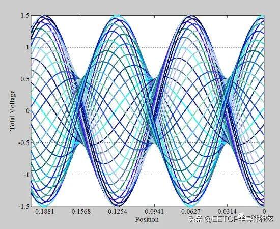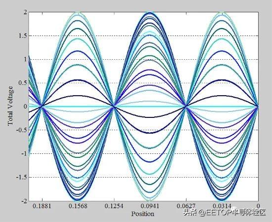 请注意,包络线的最小值为零伏。我们可以对任意负载重复相同的过程,比如 Γ = 0.5 的负载。这种情况下 36 个不同时刻的电压波形图如图 4 所示。图 4.另一个示例图显示了 36 个实例的电压波形。