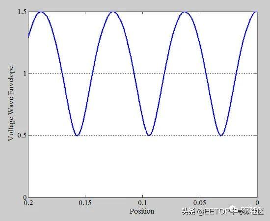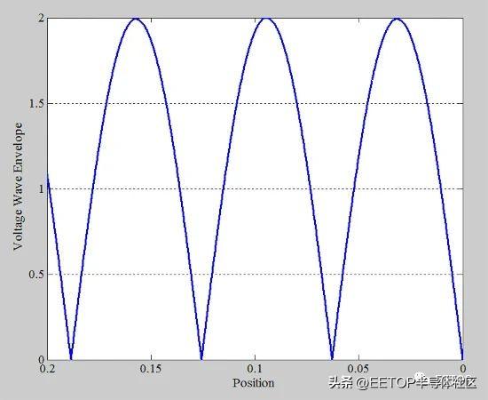 对于短路或开路的传输线,会发生全反射,入射波和反射波的干扰会在传输线上产生驻波。例如图 1 所示。图 3. 振幅变化图。