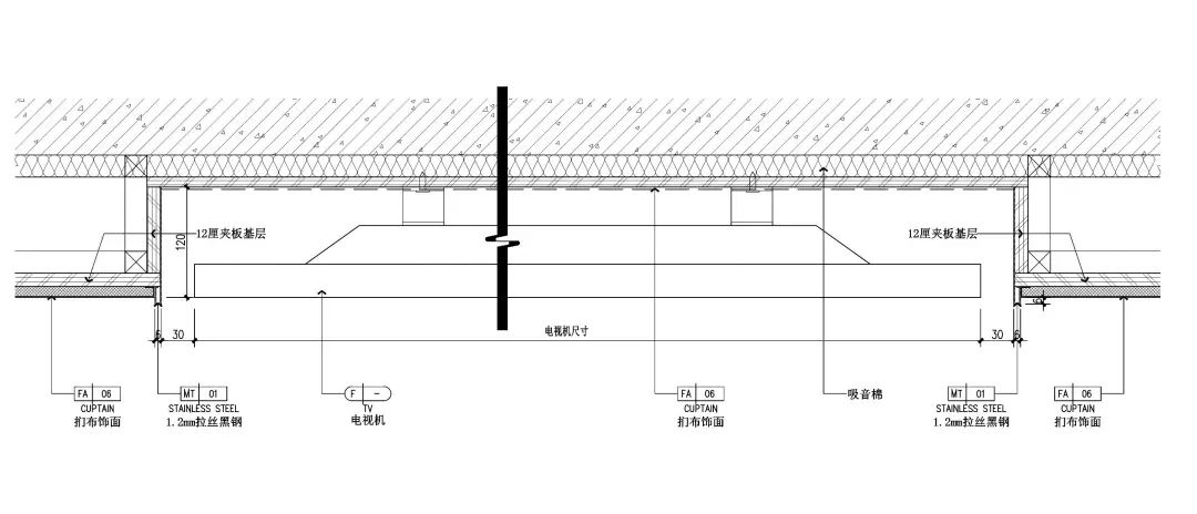 电视背景墙采用扪布饰面硬包结合1.2mm拉丝黑钢属条装饰,壁龛需考虑TV、散热与金属收边条的关系等;