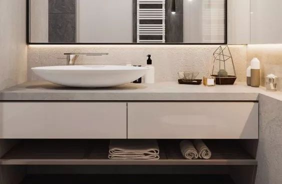 迷你吧可结合电视柜设计,满足基本的迷你吧功能性需求外(茶水壶、咖啡机、小冰箱等设备摆放),需要考虑茶水壶热气对墙面材料的影响。