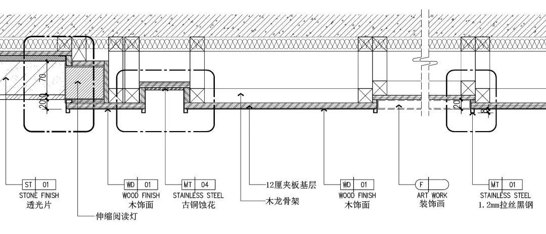 床头扪布饰面两侧各留255mm宽 的竖纹木饰面,收口使用1.2mm 拉丝黑钢作为边条,再往两边就是镶嵌的80mm 古铜蚀花条。