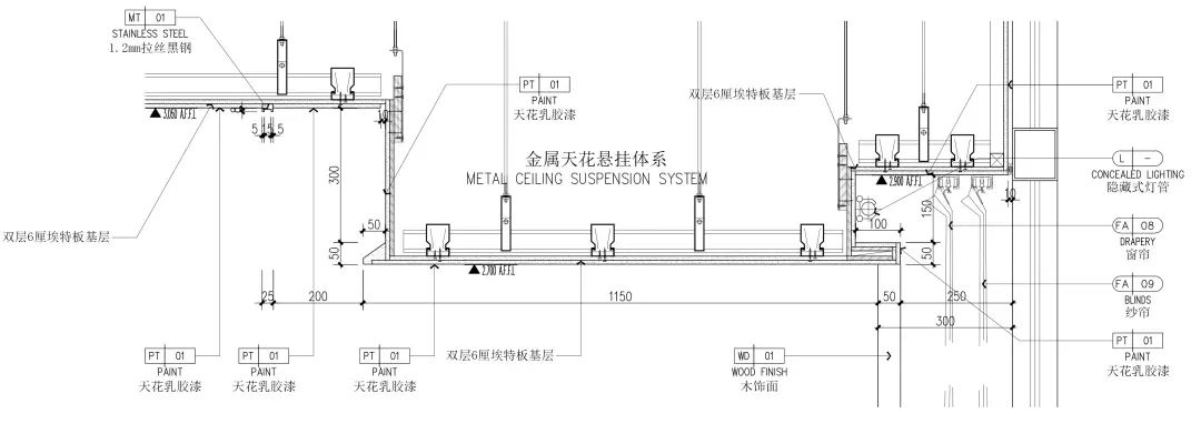 ST: 石材(花岗岩、大理石、玉石等)WD: 实木、木饰面、木地板MT: 金属饰面(铜、铁、钢、铝、铝合金)PT: 油漆(油漆、涂料、氟碳喷涂等)L: 隐藏式灯光PL: 石膏线WC: 墙面饰材(多指墙纸/墙布/喷绘/刺绣)CP: 地毯MO: 马赛克UP: 皮革RF: 窗帘、窗纱GL: 玻璃MR: 镜子01. 天花