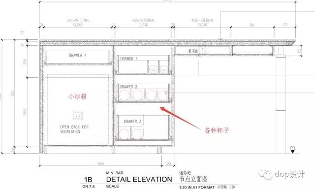 台面需考虑止水、迷你吧柜体内小冰箱的规格尺寸、散热处理等,柜内设有背景光源,开门需考虑开关。