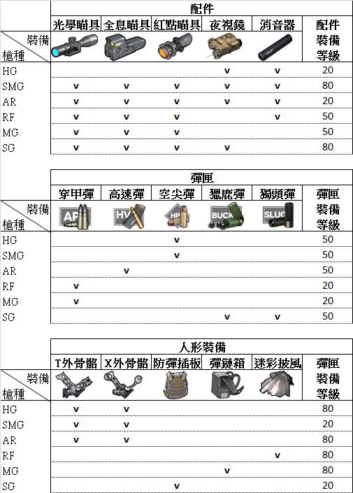 接著就开始看一下各枪枝类型能装备什麽样的装备