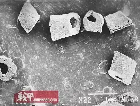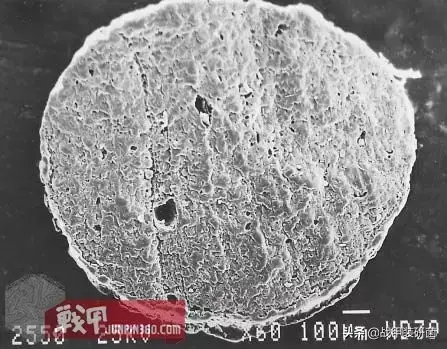 “苏纳尔SV”型无烟发射药,单一颗粒放大100倍后,其多孔结构以及中间的通道(大孔)清晰可见,燃