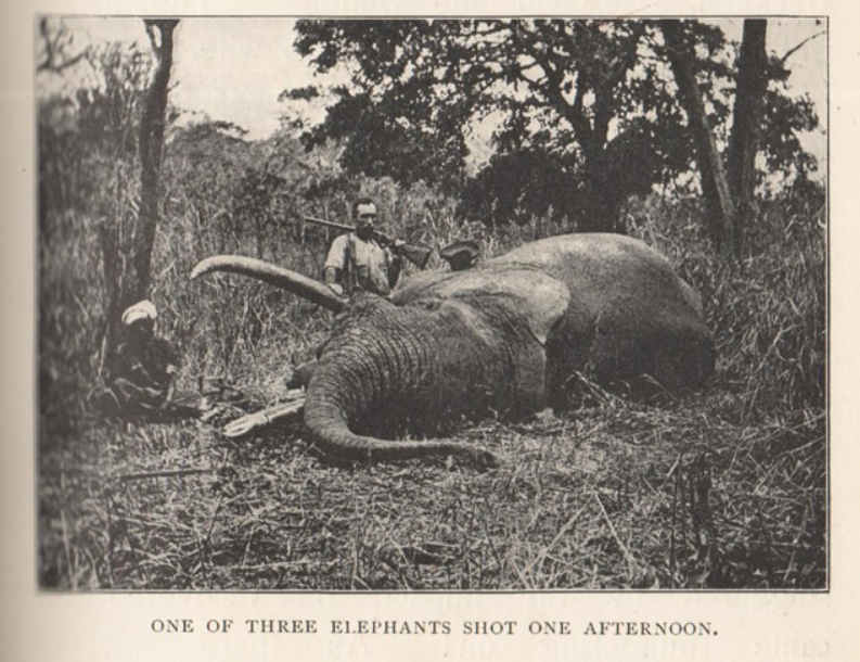 这种猎枪在19世纪末、20世纪初列强瓜分非洲的运动中非常流行。毕竟非洲的野生动物都大个,要不一枪把动物干翻,要不全村到你家吃饭,所以单发威力很重要。下边这个图就是一个著名的猎人萨瑟兰在非洲用.577双管猎枪干掉一头大象的照片。这孙子一辈子大概干掉了1300-1600头大象,还写成了一本大象猎人历险记一书。