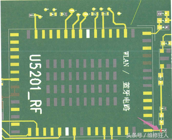 拆机后发现WiFi芯片是已经更换过的,为了确定WiFi芯片本身好坏,先飞一条天线出来代替WiFi芯片外围的天线电路。飞天线的方法是从C5213_RF靠WiFi的一端飞一条10cm左右的漆包线充当天线。WiFi飞天线位置如图1-1所示。