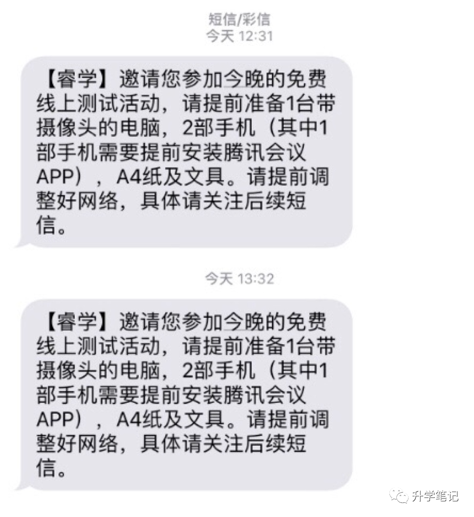 接到上面短信后告诉家长一个网站进去答题,全程开着电脑摄像头,然后在孩子背后要架起手机,全程录像,监考老师一边看着笔记本电脑的摄像头,一边看着孩子背后的腾讯会议摄像头。考了语数英三科,90分钟,数学三星以上难度,个别提达到五星难度,七大模块全有,有选择有填空。语文有阅读关于过年的和延伸的写段话,没有正经作文。基本通过ssy和cz推荐参加,大约90左右学生。英语一道大题,有阅读和完型。除此外还有小部分周边小学的孩子接到了电话,三年区三好,预计后面还会有一次。另外昨天还进行了美术线上测试。