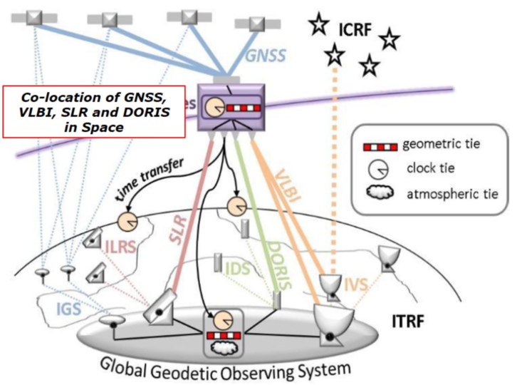 全球导航卫星系统(GNSS); 卫星激光测距(SLR)技术 :利用部署在地面上的卫星激光测距系统所发射的激光脉冲,跟踪观测装有激光反射棱镜的卫星,以测定观测站到卫星之间的距离的技术和方法;甚长基线干涉测量(VLBI)技术 :用于射电天文学中的天文干涉测量方法,其运用电磁波的干涉原理,用多面天线组成射电阵面同时观测同一个目标,观测结果为多面镜的干涉结果以得到很高的分辨率;陆基多普勒无线电定轨定位系统(DORIS) :基于多普勒效应和无线电测距原理,通过互联的地面基准站和卫星上的各种设备来实现定轨定位的技术。“创世”(GENESIS)原理示意图