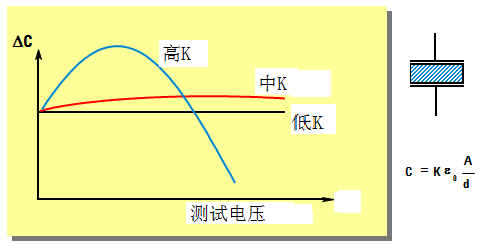 ● 电容值 (或材料的介电常数,即 K值 ) 的测量结果会依赖于交流测量信号电压值的大小。