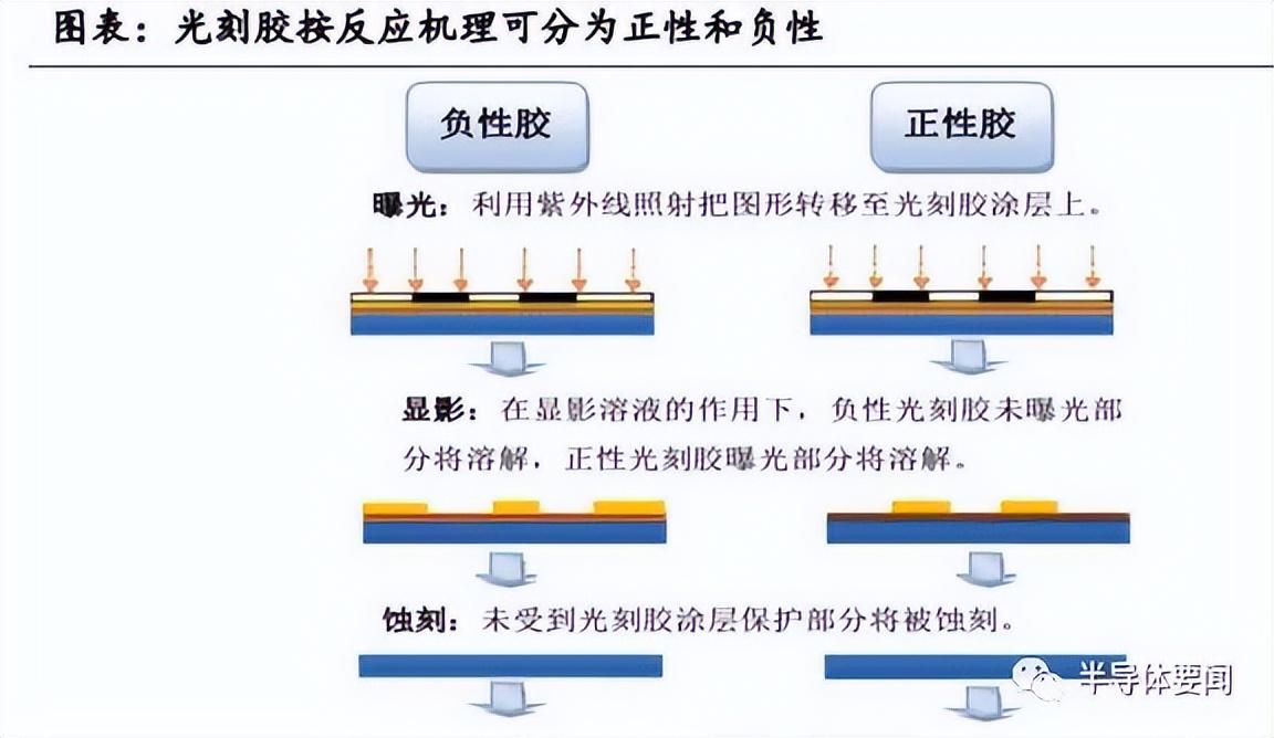 根据化学反应机理不同,光刻胶可分正性光刻胶和负性光刻胶。正性光刻胶受光照射后,感光部分发生分解反应,可溶于显影液,未感光部分显影后仍留在基底表面,形成的图形与掩膜版相同。负性光刻胶正好相反,曝光后的部分形成交联网格结构,在显影液中不可溶,未感光部分溶解,形成的图形与掩膜版相反。