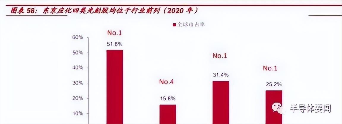 东京应化拥有半导体光刻胶完整布局,2020 年,从 g/i 光刻胶到 EUV 光刻胶,东京应化分别拥有 25.2%、31.4%、15.8%、51.8%的市占率,除了 ArF 光刻胶位列第四以外其他均为第一,成为当之无愧的全球光刻胶龙头企业。