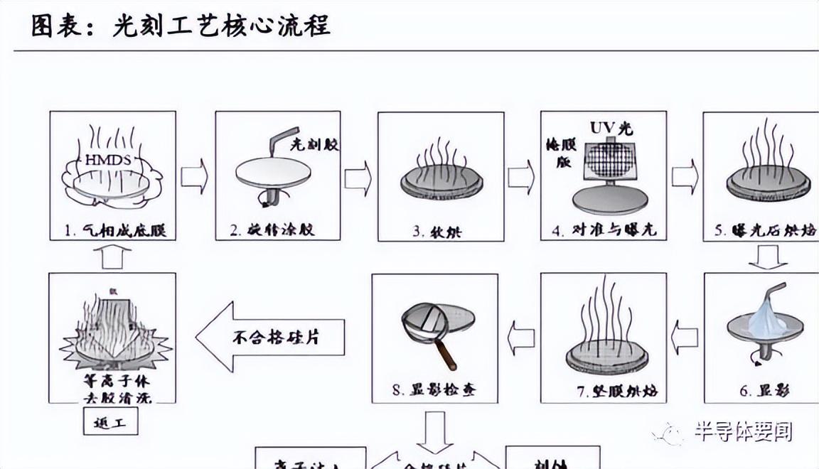 光刻技术是指利用光学-化学反应原理和化学、物理刻蚀方法,将图形传递到介质层上,形成有效图形窗口或功能图形的工艺技术,是光电信息产业链中的核心环节之一。以芯片制造为例,在晶圆清洗、热氧化后,需通过光刻和刻蚀工艺,将设计好的电路图案转移到晶圆表面上,实现电路布图,之后再进行离子注入、退火、扩散、气相沉积、化学机械研磨等流程,最终在晶圆上实现特定的集成电路结构。