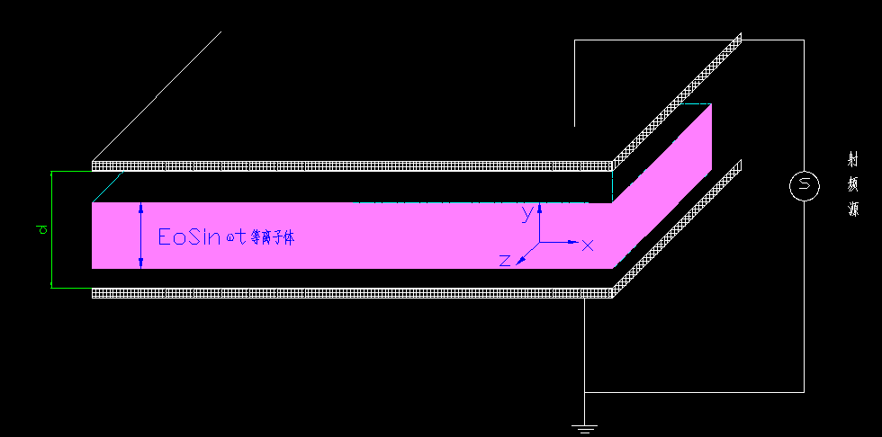 对于电容耦合高频等离子体源,维持在平行平板电极间的等离子体主要由高频电场加热。多数电容性耦合射频等离子体反应器是非磁化的,工作的频率范围是1~100MHz,,低于电子响应电磁场的电子等离子体频率,即ω<ωpe。非磁化容性耦合射频放电模型如图2所示,因为采用容性耦合射频放电可以产生大面积的稳定的等离子体,电容性放电已经成为低气压放电材料处理中应用最广泛的等离子体源。