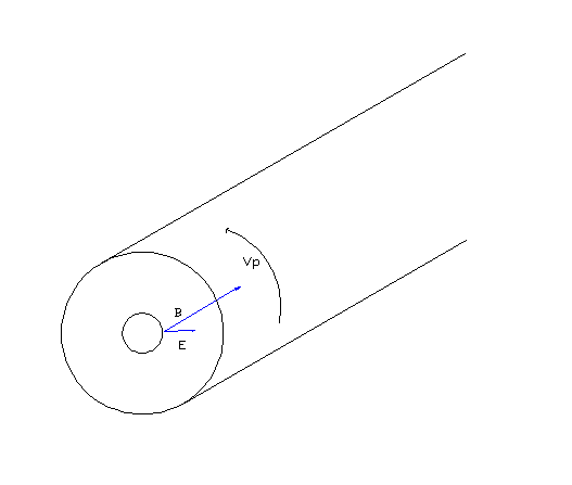 当采用同轴圆柱RF振荡产生等离子体时如图3,电场沿径向方向,磁场沿轴向方向,E × B 为环向,而且电场E 的方向是随着RF振荡持续变化的,所以环向等离子体流会使得等离子体分布更加均匀。