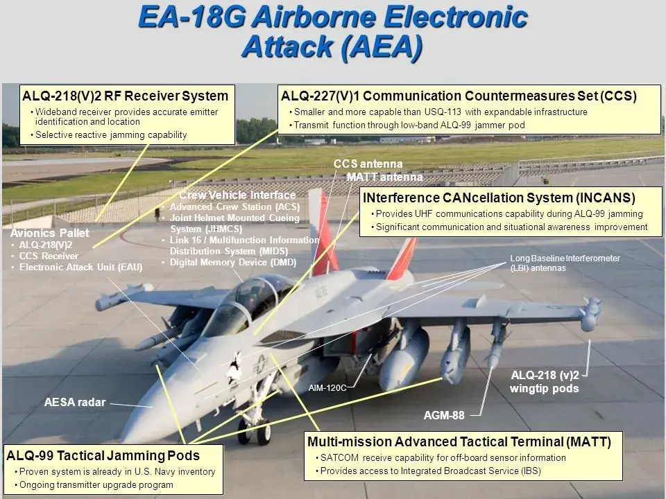 EA-18G“咆哮者”电子攻击机(EA-18G Growlercarrier-based electronic warfareaircraft),是在F/A-18E/F“超级大黄蜂”战斗机的基础之上搭载各类电子战任务系统发展而来的。作为美军网络中心战体系的重要组成部分,EA-18G配备了“多任务先进战术终端”(MATT)、“多功能信息分发系统”(MIDS)和Link-16数据链等,拥有完备的电子作战能力。EA-18G以其强大的电子战能力可对敌防空武器进行全面的电磁压制,并且实施反辐射打击。