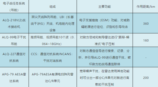 各电子战和网络战任务系统与飞机平台之间通信和数据接口采用电子攻击单元(EAU)连通,EAU负责协调飞机平台的导航数据,并完成向飞行员提供电子战数据的显示和文件记录功能。在整个作战过程中,电子战任务系统占据着最高优先级的主导地位,并在其他航电系统的紧密配合下完成各种电子战作战任务。其主要系统和功能如下表。