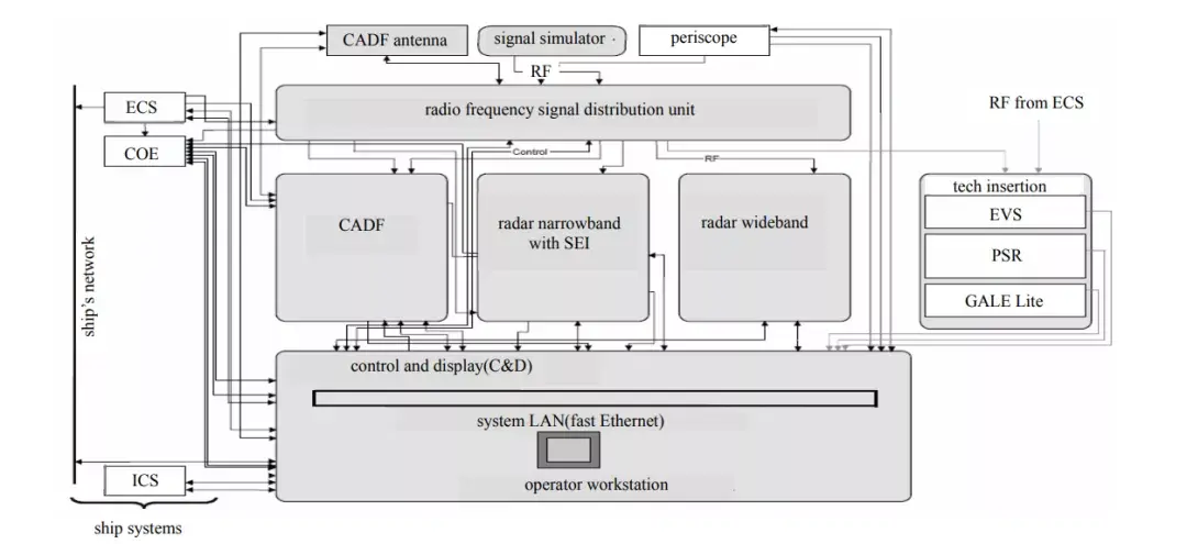 AN/BLQ-10(V)是一种综合雷达、通信ESM的系统,同时具备威胁告警与情报搜集能力。为实现与作战系统集成、减少设备数量、便于技术插入等目标,该系统采用开放式体系架构,如下图所示。该系统主要由天线单元、信号分发单元、通信ESM子系统、雷达ESM子系统、操作员工作站等5部分组成,通过以太网与艇上其他系统连接。雷达信号天线单元具有高度集成化与模块化的特点,安装于综合ESM桅杆(IETM)和光电桅杆上。