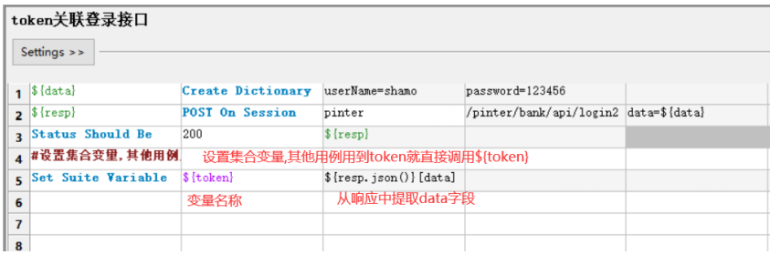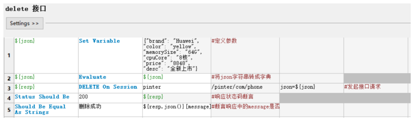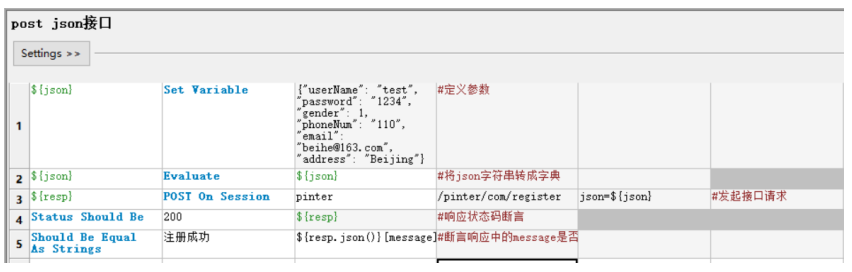 由于json格式参数通常比较多,所以我们将他定义成了普通变量,但是接口关键字请求时json参数 必须是字典格式,所以使用Evaluate关键字将字符串形式的json参数转换成字典