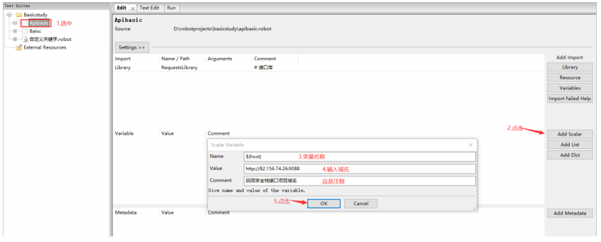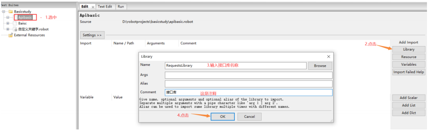 创建一个测试集合apibasic,选中后在设置区导入RequestsLibrary库
