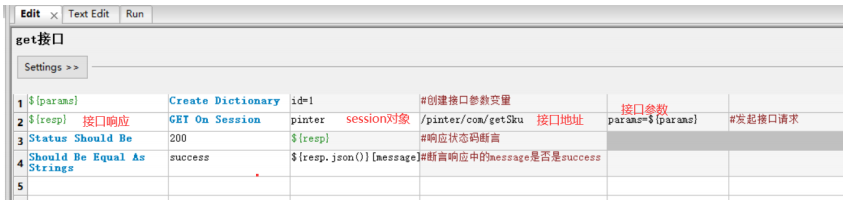 Create Sesion:这是接口库提供的一个关键字,用来创建一个session对象pinter:这是自定义起的一个session对象的名字,用于后续其他地方要使用时进行引用${host}:这是引用集合变量定义的host2. get接口