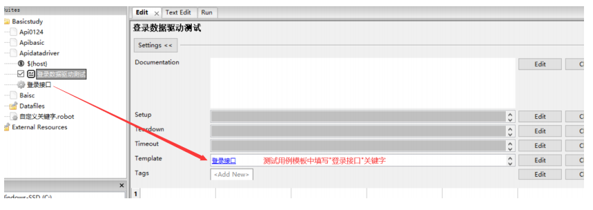 测试用例中只需要在设置的模板中填写第5步创建的登录接口关键字即可