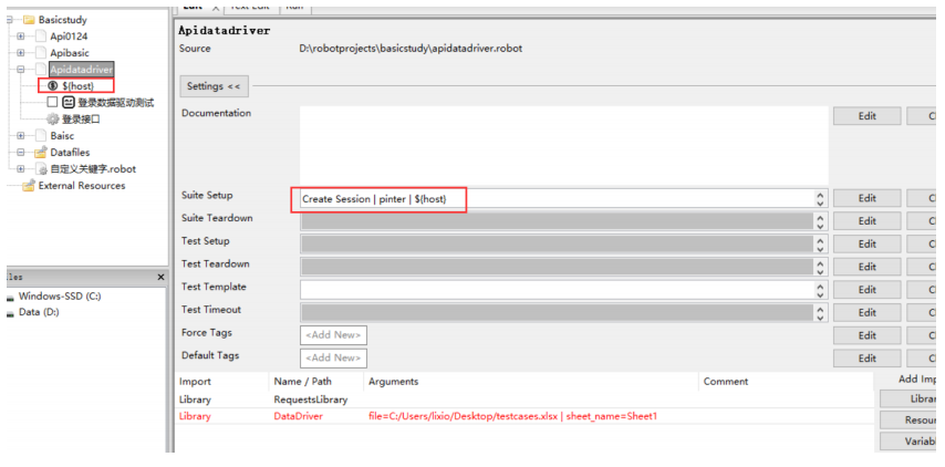 创建测试集合apidatadriver,导入库RequestsLibrary和DataDriver,注意导入DataDriver时要写参数,导入后标红的话先不用管,继续做