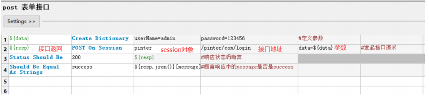 Get On Session:发起get请求的关键字${resp.json()}[message]:表示提取接口响应body体重的message字段3. post 表单接口