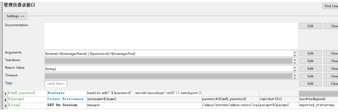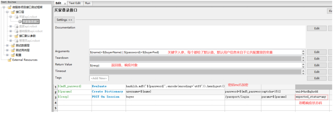 由于各个服务在测试时都必须先完成登录获取token,所以我们将各个服务的登录做成关键字 在业务关键字.robot下进行依次创建和封装