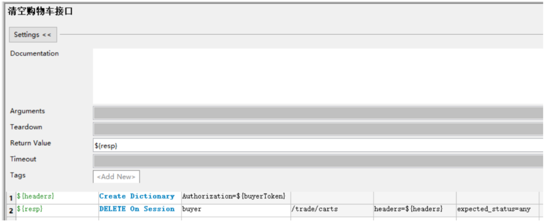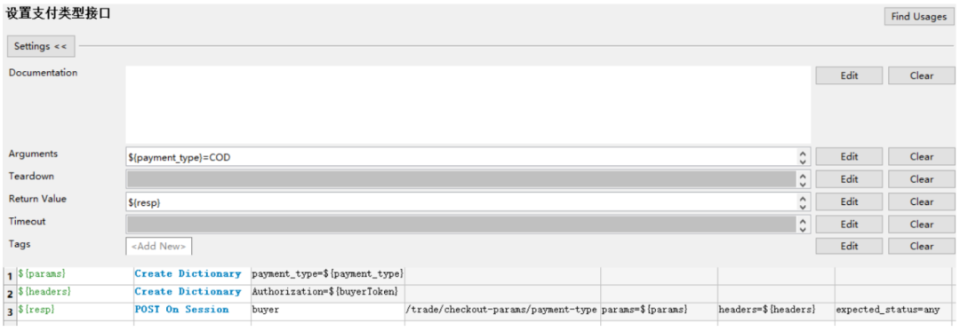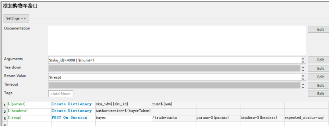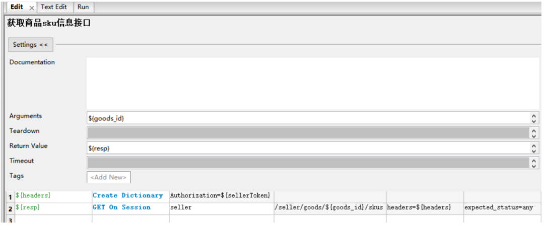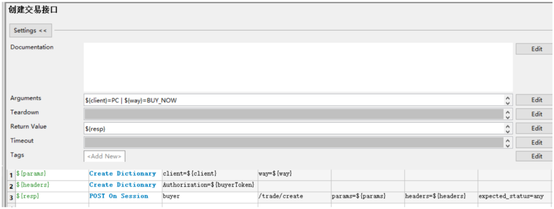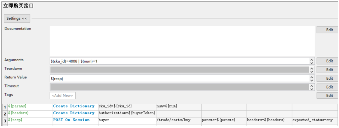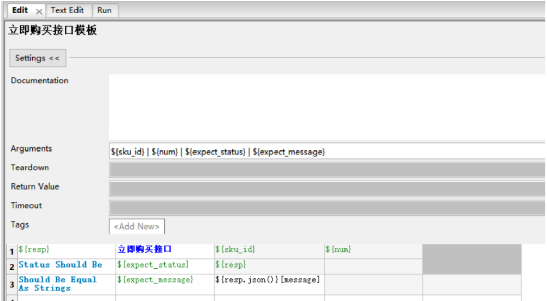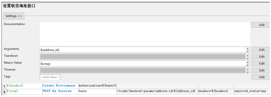 在[接口默认参数]目录中创建一个 评论.json文件,内容写所有参数的默认值,其中写xxxx代表这个是动态数据,必须每次都由调用方传递 关键字入参的含义: ${order_sn}、${sku_id}都是必传参数,${other}给了一个默认值,表示可以不传,如果用户需要针对json参数里除了order_sn和sku_id的参数进行测试时就要以${other}代表,${other}的传递规则是字符串形式的json格式字符串,key必须是jsonpath表 达式,value是要替换的新值例如: 针对替换json串中的特定字段封装一个自定义关键字 ,在业务关键字.robot下创建一个用户自定义关键字如下,业务关键字需要导入JSONLibrary 脚本解释: 第一行:读取 [接口默认参数] 目录下的评论.json文件,得到默认json参数 第二/三行:把用户传入的order_sn和sku_id更新到${comment_info}中去 第四行:判断${other}不等于default,说明用户传了其他数据,那么${other}转换成json第五行:判断${other不等于default},调用[替换json数据]关键字替换并且返回数据02