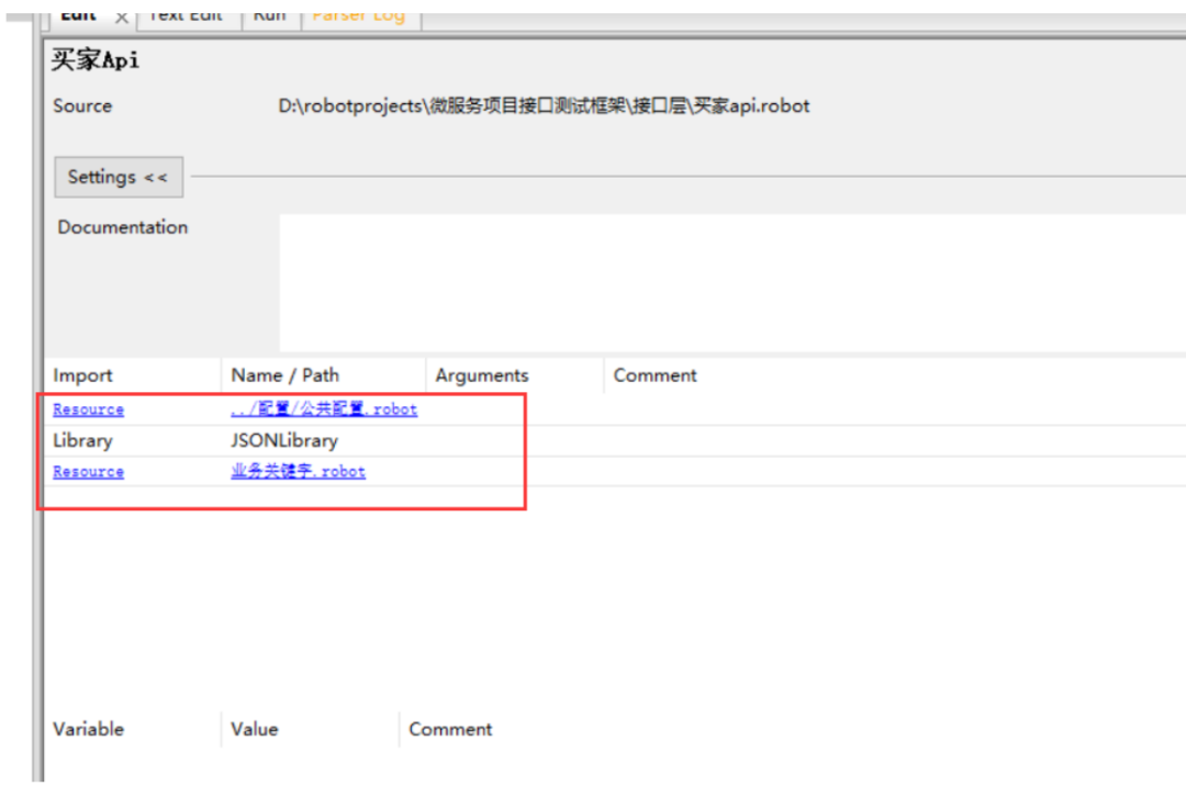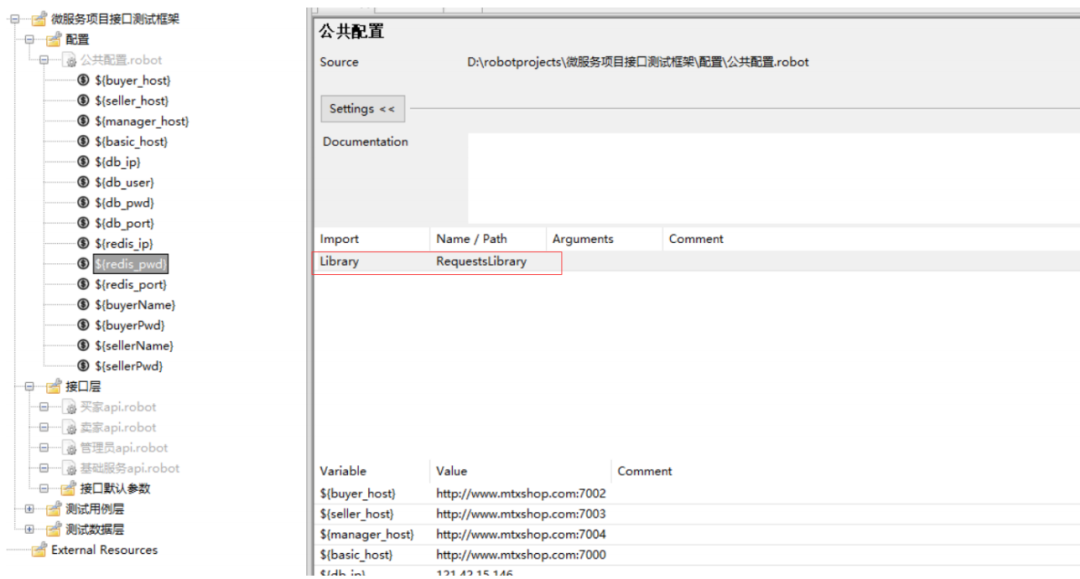 根据项目情况,添加公共配置变量,各个服务的域名,数据库信息,redis信息,买家/卖家/管理员账号,并且导入需要的第三方库RequestsLibrary