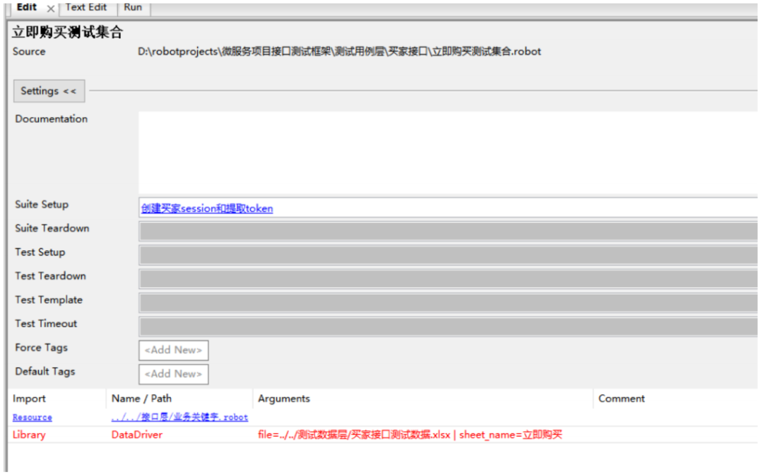 买家api :这是一个Resource,创建是右键接口层New Resource卖家api :这是一个Resource,创建是右键接口层New Resource管理员api :这是一个Resource,创建是右键接口层New Resource基础服务api :这是一个Resource,创建是右键接口层New Resource接口默认参数 :这是一个目录,当接口参数比较多时,用来存储默认参数的,存到文件里, 方便管理业务关键字 :这是一个Resource,用来封装一些自定义的业务关键字,创建是右键接口层 New Resource测试用例层: 这是一个目录,用来管理所有测试用例