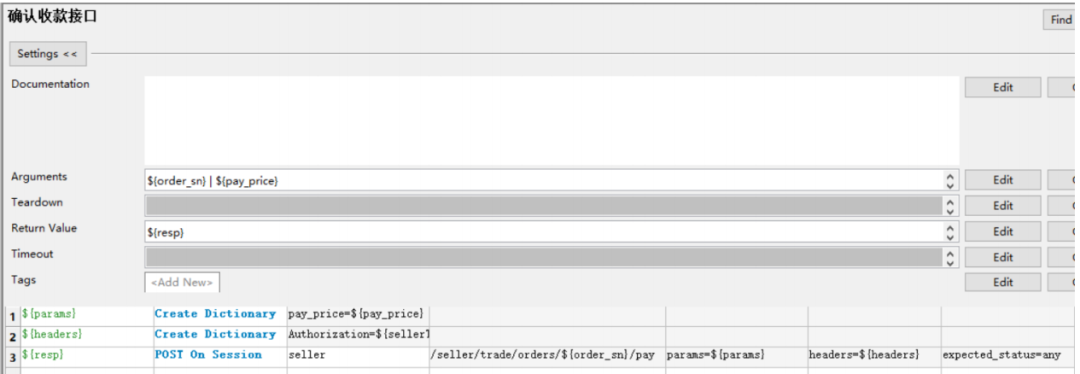 在[接口默认参数]目录中创建一个 创建商品.json文件,内容写所有参数的默认值 关键字入参的含义: ${new_params}给了一个默认值,表示可以不传,不传时接口使用默认参数发起请求,如果用户需要针对默认json参数里的某些字段进行修改,${new_params}的传递规则是字符串形式的json格式字符串,key必须是jsonpath表达式,value是要替换的新值例如 脚本解释 第一行:读取默认参数第二行:判断有${new_params}不等于default,说明用户传了其他数据第三行:判断有${new_params}不等于default,调用[替换json数据]关键字替换并返回3、确认发货接口