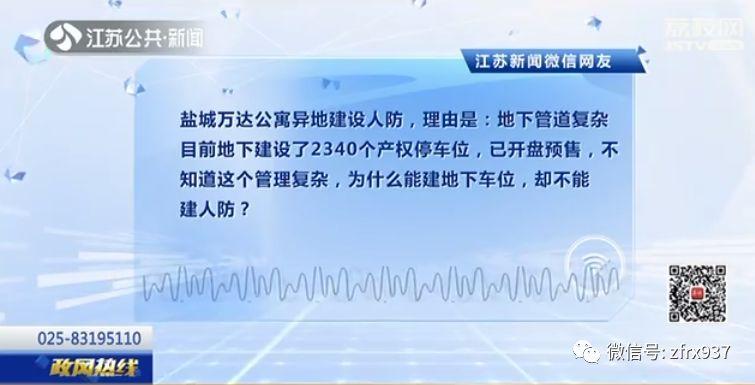 节目中有网友留言:盐城万达公寓易地建设人防,理由是地下管道复杂,目前地下建设了2340个产权停车位,已开盘预售,不知道这个管理复杂,为什么能建地下车位,却不能建人防?