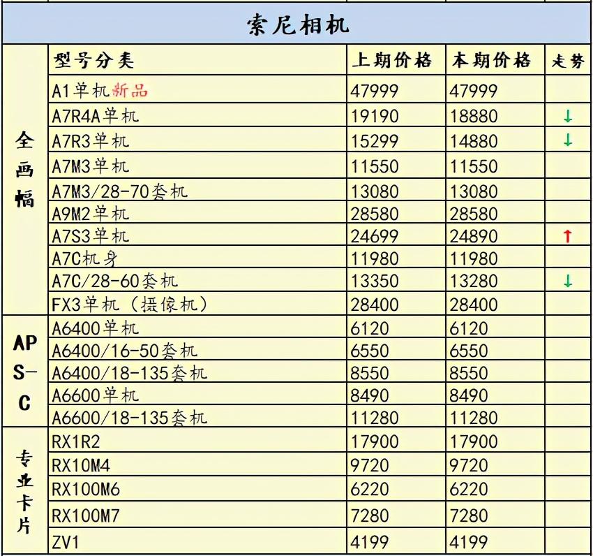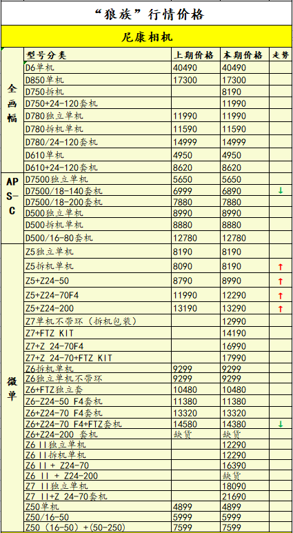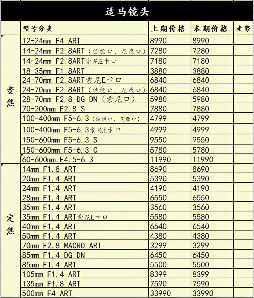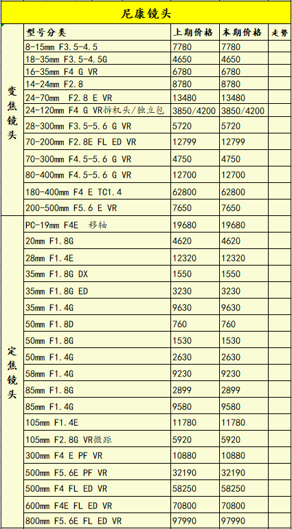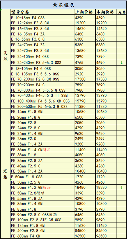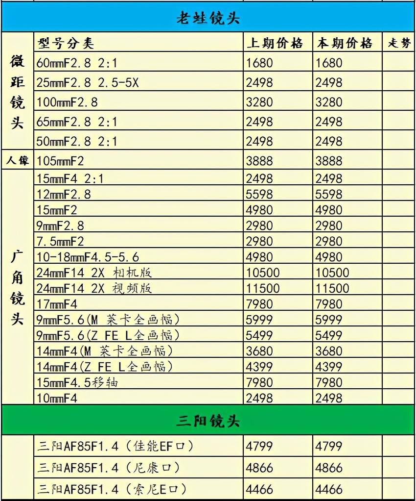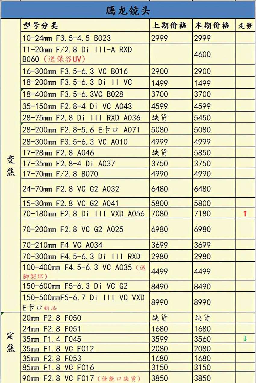 索尼方面,因为发布会的时间问题引众怒,相信很多人今后都不会再考虑这个品牌了。这将会成为索尼的一个转折点,给佳能、尼康更多的机会。本周A7R3和A7R4有小幅度下降, 50mmF1.2GM价格微降,其余变化不。大腾龙方面,70-180、28-200、150-500等型号持续缺货,预计13日到货哦。适马价格无变化。