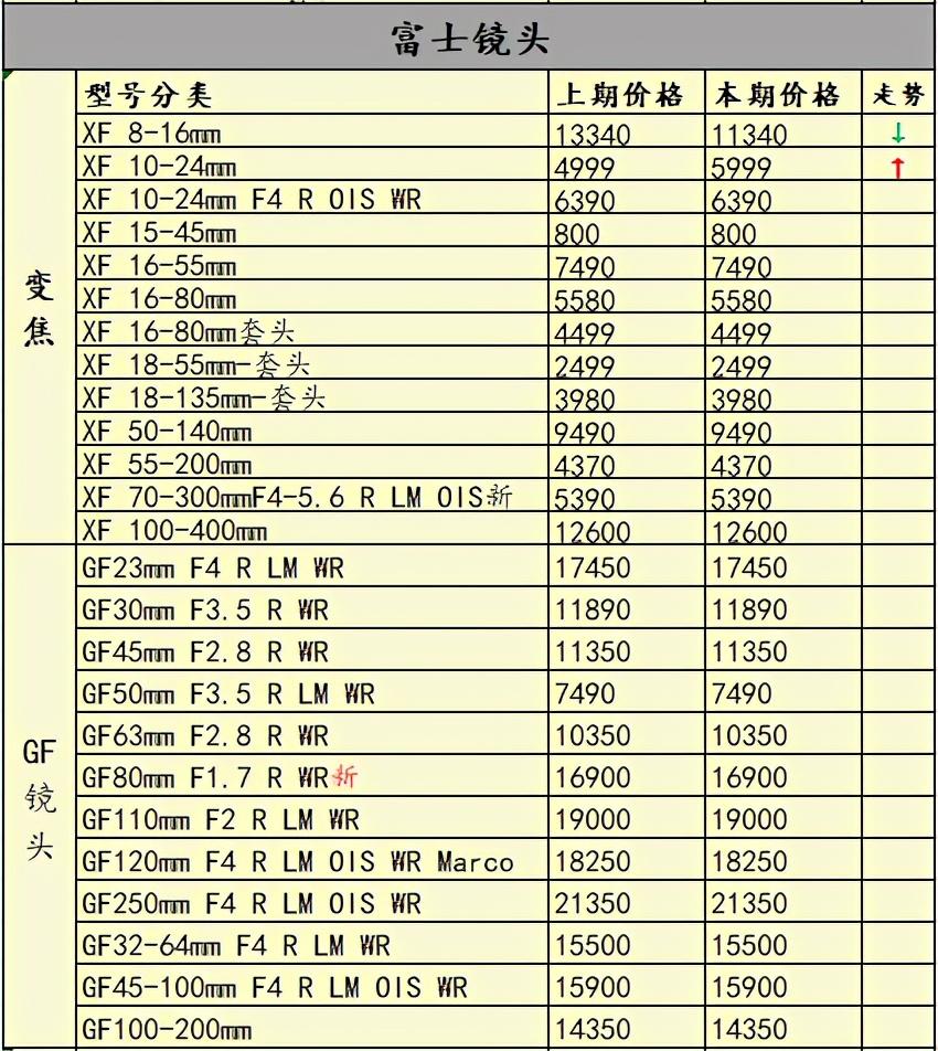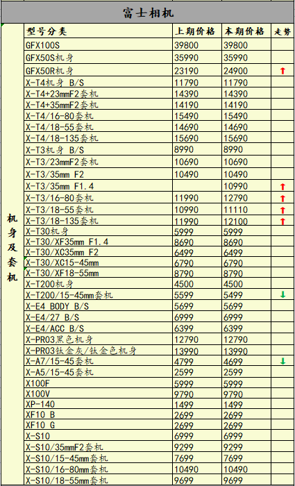 富士方面,GFX50R价格大幅度上涨,X-T3系列单机套机价格上涨,XF200mmF2价格上涨,具体行情参考下面报价: